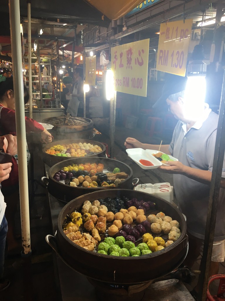 I died and went to food heaven. Ik loop oh’end en OOOH’end arm en arm met mijn tante langs de foodstalls. Otak-otak, viscake pakketjes in bananenbladeren gewikkeld en vers gegrild, megastoommanden vol dim sum in alle kleuren van de regenboog, mochi ijs, nog meer durian, satay celup: tientallen verschillende soorten satay stokjes waarvan je kiest wat je lekker vindt en ter plekke zelf in een pot hele bouillon kookt. Alles gaat in die bouillon, dus die wordt steeds lekkerder en lekkerder. ‘Celup’ betekent ‘dopen’ en is een onomatopee (look that up) van het daadwerkelijke geluid van het dopen van je satay in de bouillon. De Asian versie van het geluid, dan. Je spreekt het uit als ‘tjeloep’. Klopt wel hè? 🙂 Hopelijk kunnen we later deze week in Malacca de satay celup der satay celups gaan eten bij restaurant Capitol!