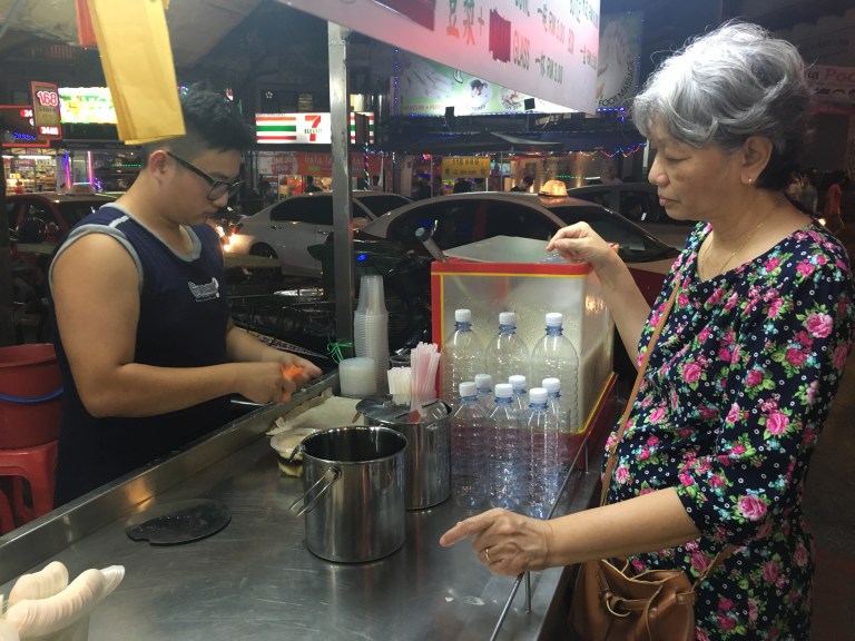 Na het eten lopen we terug door de Jalan Alor en kan ik het niet helpen om nog verder hyped te worden dan ik al was. Wat een paradijs aan eten! Sugarcane, of in het Maleis air tebu, mijn eerste jeugdliefde. Lange palen suikerriet worden door een mangel gehaald, en het sap smaakt zoet en een beetje grasachtig. Ik weet nog dat ik vroeger terug in Nederland huilde omdat ik het zo graag wilde drinken, maar niets is hetzelfde als versgemangelde sugarcane. Vroeger kreeg je het in een zakje met een knoopje en een rietje erin, nu koop ik met hartjes in mijn ogen een moderne versie in een flesje.