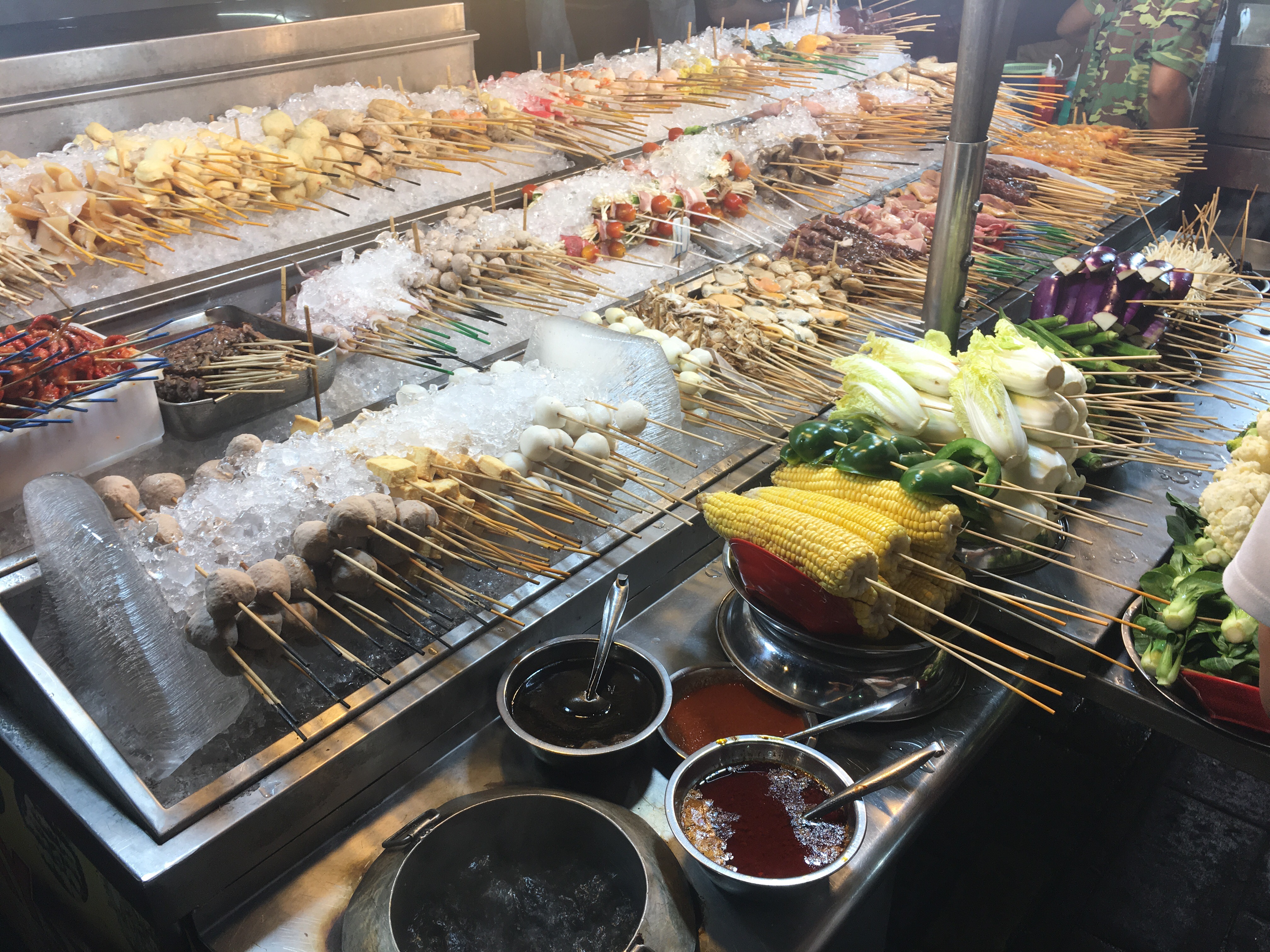 I died and went to food heaven. Ik loop oh’end en OOOH’end arm en arm met mijn tante langs de foodstalls. Otak-otak, viscake pakketjes in bananenbladeren gewikkeld en vers gegrild, megastoommanden vol dim sum in alle kleuren van de regenboog, mochi ijs, nog meer durian, satay celup: tientallen verschillende soorten satay stokjes waarvan je kiest wat je lekker vindt en ter plekke zelf in een pot hele bouillon kookt. Alles gaat in die bouillon, dus die wordt steeds lekkerder en lekkerder. ‘Celup’ betekent ‘dopen’ en is een onomatopee (look that up) van het daadwerkelijke geluid van het dopen van je satay in de bouillon. De Asian versie van het geluid, dan. Je spreekt het uit als ‘tjeloep’. Klopt wel hè? 🙂 Hopelijk kunnen we later deze week in Malacca de satay celup der satay celups gaan eten bij restaurant Capitol!